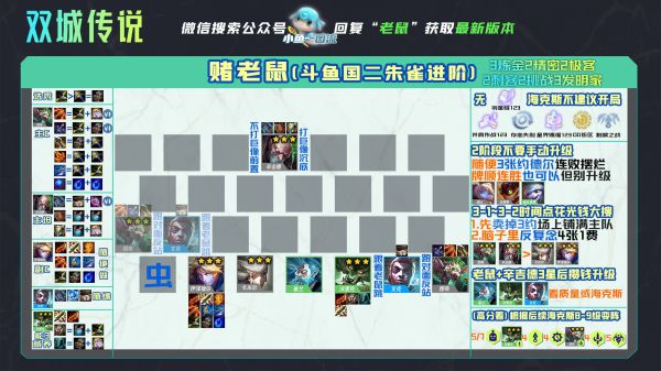 运营节奏:攻速开找分裂,海克斯选羽量级、存心失利最佳,2阶段不升级,建议3约德尔连败,3-1到3-2花接近所有的钱去追4张1费卡,追的时候记得先提前把3约德尔卖掉,把主队到2的牌换上场,然后重复刷新-抓牌动作,有其他1费牌也要抓一下,可以压缩整个1费卡池的空间,老鼠3星以后,攒钱升6升7毕业,然后就看经济和血量是否允许上8/9,根据海克斯补充阵容强度,最好的是5发明或者4刺,没有就补迦娜/悠米