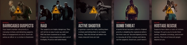 人质营救(Hostage Rescue)——极难嫌犯劫持了一个屋子的平民作为人质。悄悄接近,指定战略,并迅速执行。无辜平民的生命就在你的手上。