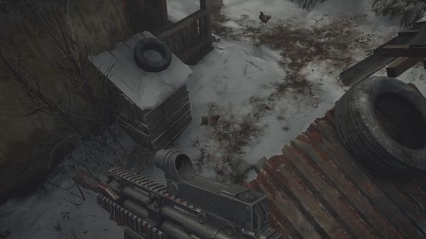 禽肉x3:村庄中部,红烟囱房间旁边的空地上有三只鸡在乱跑,从房顶上也能看到