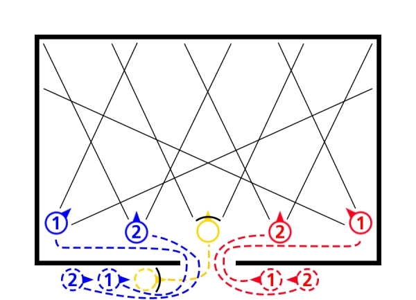 - 下楼就容易很多了,从上方可以更好地观察到楼梯的各个位置。一个人负责当前楼层的警戒,其他人则前往下一层,离开当前楼层后,警戒人员返回团队中,依次类推。虽然比较简单,但也不是毫无风险,因此也要随时准备应对突发情况。 进房顺序