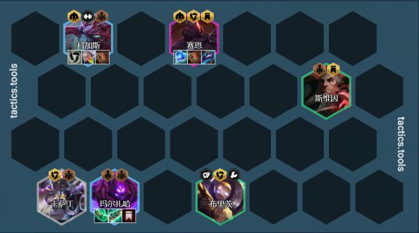 卡萨丁/机器人站位:左右吃钩子,中期无转职7人口机器人通常情况挂在3星玛尔扎哈旁边,钩一个过来挂毒秒掉,传染2个,后期换成蒙多或者卡莎或者斯维因提升上限